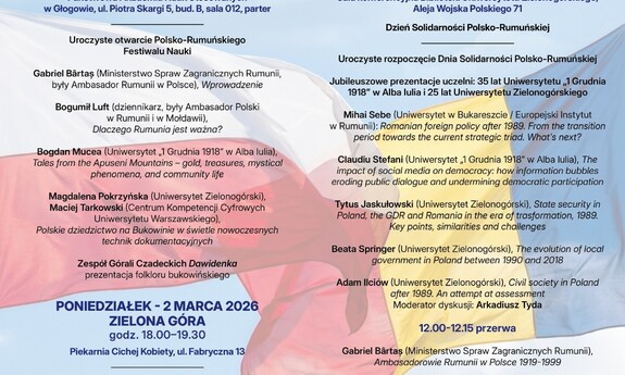 Dzień Solidarności Polsko-Rumuńskiej był już świętowany w Zielonej Górze i Głogowie w 2025 roku – jako wydarzenie dwudniowe. Tegoroczne obchody Dnia Solidarności Polsko-Rumuńskiej zostały zorganizowane z większym rozmachem, niż rok temu, jako wydarzenie transgraniczne, realizowane zarówno w Polsce jak i w Rumunii, przy czym wplecionych jest w to wspólne świętowanie kilka innych wydarzeń. Przede wszystkim Dzień Solidarności 3. marca to jeden z dni Polsko-Rumuńskiego Festiwalu Nauki, który odbędzie się w Głogowie (1.03.2026), Zielonej Górze (2-3.03.2026) i Alba Iulia (06.03.2026). Wezmą w nim udział naukowcy z Polski i Rumunii, studenci polscy i rumuńscy z Zielonej Góry, Głogowa i Alba Iulia, mieszkańcy tych miast i regionów lubuskiego, dolnośląskiego oraz Siedmiogrodu. Wykładowcami Festiwalu będą dyplomaci z Rumunii i Polski. Artystyczny akcent wniosą zespoły regionalne prezentujące folklor bukowiński oraz młodzi artyści z Instytutu Muzyki UZ. Festiwalowi towarzyszyć będzie szkoła polsko-rumuńska zorganizowana przez S. Kondej i M. Pokrzyńską we współpracy z B. Mucea i C. Stefani: Borderlands of Cooperation: Polish-Romanian Spring School Studying the Interference of Culture, Science, and Art. Jej pierwsza część odbędzie się w Polsce (w Zielonej Górze i Głogowie) 27.02.2026 – 03.03.2026, a druga w Rumunii (w Alba Iulia, Sibiu i Cluj) 05.03.2026 – 10.03.2026. Festiwal oraz szkoła Borderlands of Cooperation będą wpisane w obchody 25-lecia Uniwersytetu Zielonogórskiego i 35-lecia Uniwersytetu w Alba Iulia, towarzysząc również celebrowaniu roku 2026 jako czasu, w którym Alba Iulia jest stolicą rumuńskiej młodzieży.