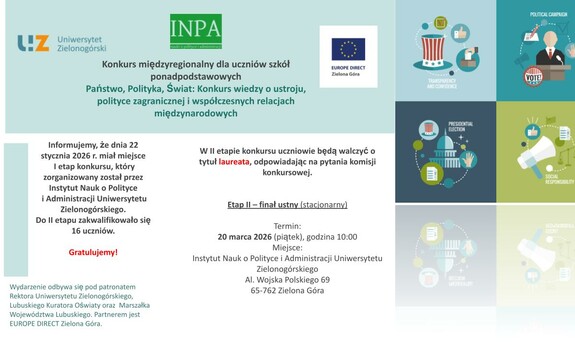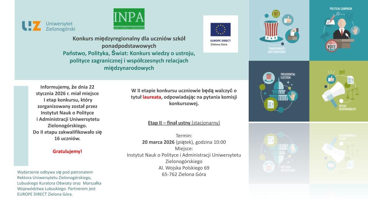 Instytut Nauk o Polityce i Administracji Uniwersytetu Zielonogórskiego z radością informuje, że dnia 22 stycznia 2026 r. miał miejsce I etap konkursu międzyregionalnego dla uczniów szkół ponadpodstawowych „Państwo, Polityka, Świat: Konkurs wiedzy o ustroju, polityce zagranicznej i współczesnych relacjach międzynarodowych”. Do II etapu konkursu zakwalifikowało się 16 uczniów z: